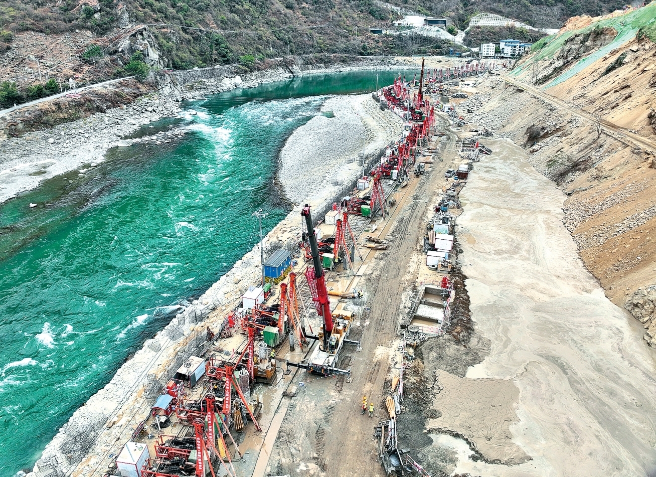 机械轰鸣,82台冲击钻在大渡河畔一字排开,正全力开挖防渗墙槽孔。