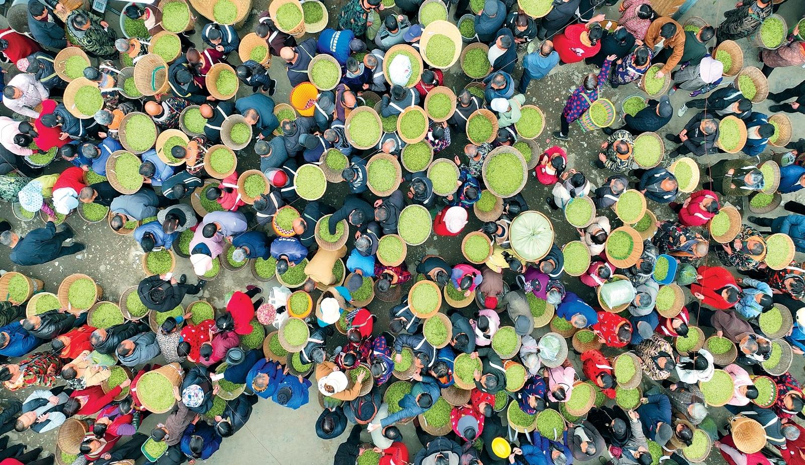 在名山区红星镇鲜叶交易市场,每日13时一开市,来自四面八方的茶农携新鲜采摘的茶芽蜂拥而入,从各地赶来的鲜叶收购商穿梭其间,现场迎来交易高峰。