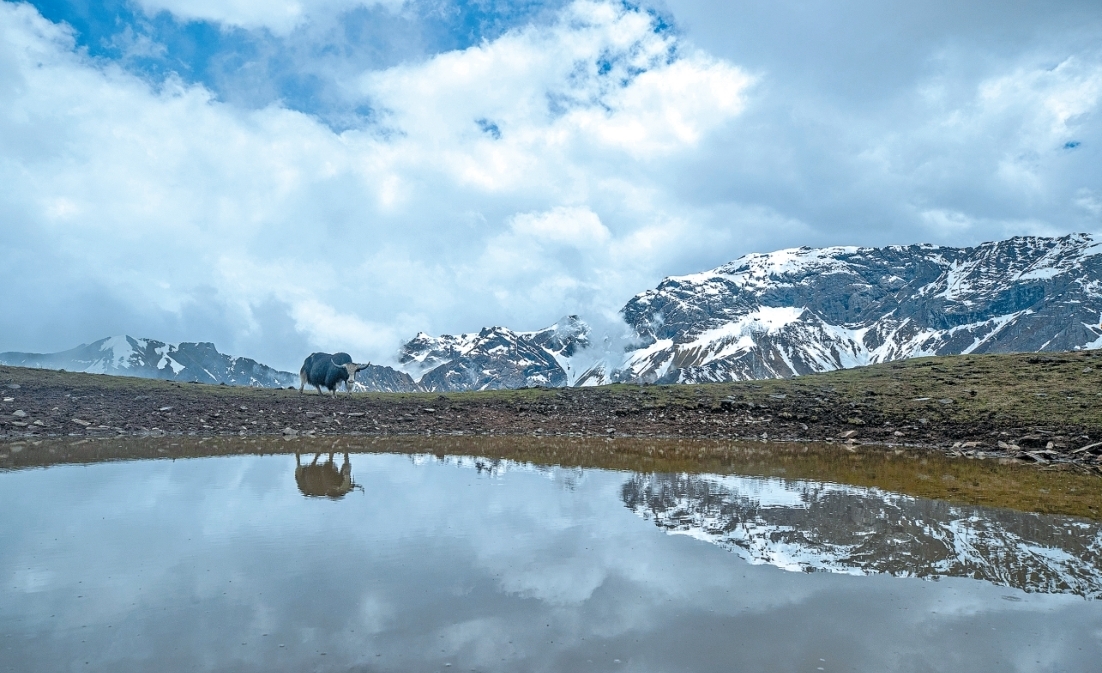 硗碛人习惯将牦牛全年散养在高山牧场。五月的草甸,新绿刺破残雪。阿全踩着泥泞的山路攀爬,去给他的牦牛“撒盐”。在海拔4100米的固定投喂点,他细心地撒下盐巴后,牦牛从四面八方聚拢。“盐巴会让牦牛记住‘家’的味道。”这是他和这群牦牛之间的默契。