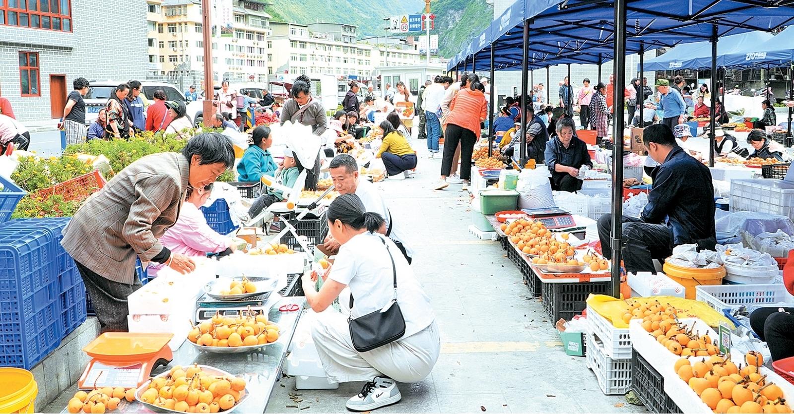 市民和游客在宝兴县穆坪镇枇杷临时交易市场内选购枇杷