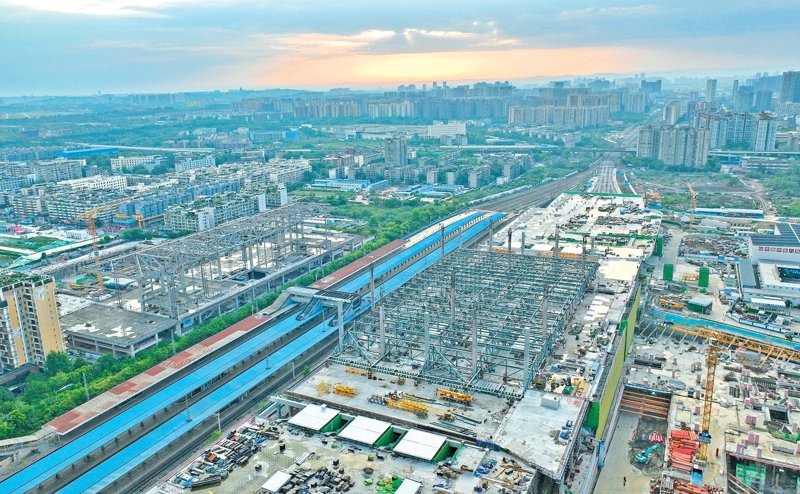俯瞰改造中的成渝中线高铁成都站(6月20日,无人机照片)。记者从中国铁路成都局集团有限公司成都建设指挥部获悉,6月20日6时,经近2000名作业人员520分钟的连续奋战,成渝中线高铁成都站南北站场交替施工圆满完成,标志着成渝中线高铁成都站改建工程整体过半,为项目按期开通奠定了坚实基础。这次交替施工是铁路营业线Ⅰ级施工,由中铁八局、中铁电气化局、成都工务段、成都电务段、成都供电段等10余家单位相互配合完成。 成都站位于四川省成都市,是新中国第一条自主建设的铁路——成渝铁路的起始站。为满足成渝中线高铁建设、市域铁路公交化改造建设等需要,车站进行了拆除扩建。车站建设采取“分步施工、南北交替”方案,将施工区域划分为南北两个作业面,实现了铁路正常运输与工程建设同步推进,完成衔接成渝、达成、宝成等多条铁路线路的拨接与改造。