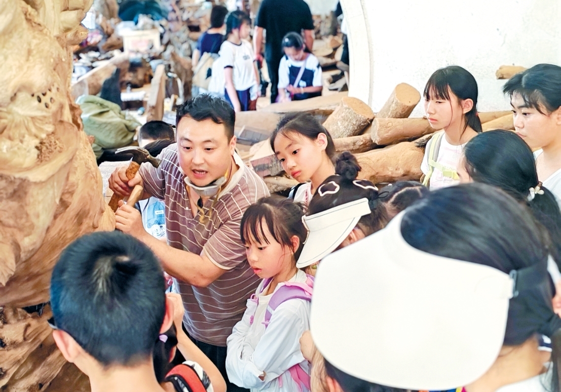 在芦山县大自然金丝楠艺术馆,孩子们在老师指导下亲手打磨独一无二的根雕作品,带走专属的非遗纪念品。芦山根雕作为芦山木雕的一部分,早在2018年便被列为省级非物质文化遗产代表性项目。近年来,芦山县借助非物质文化遗产保护的东风,大力发展根雕产业。