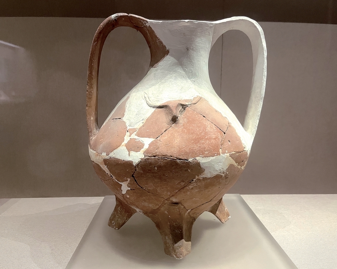 这件陶罐高36厘米,腹径29厘米,形制颇具特色。口部呈马鞍形,口沿向外撇出,颈部瘦长,腹部为圆形,底部同样呈圆形。底部的四个半圆形足向外岔开,且相互连接形成拱形,既解决了圆底陶罐放置不稳的问题,又兼顾了实用需求。肩部两侧对称装饰有牛头形状的附加堆纹,整体造型兼具功能性与艺术性。