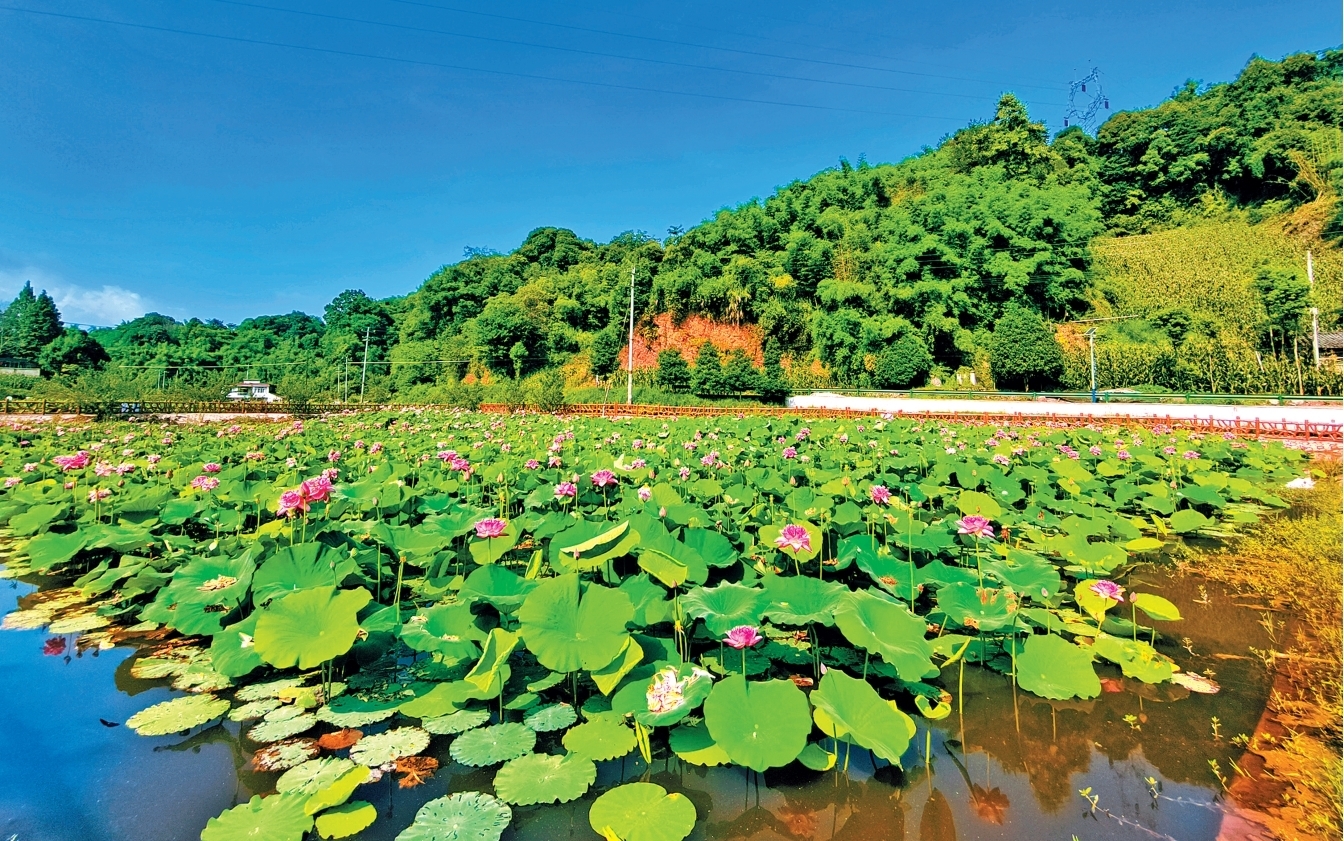 粉荷绽于翠叶间,与青山蓝天相映,绘就乡村生态美景