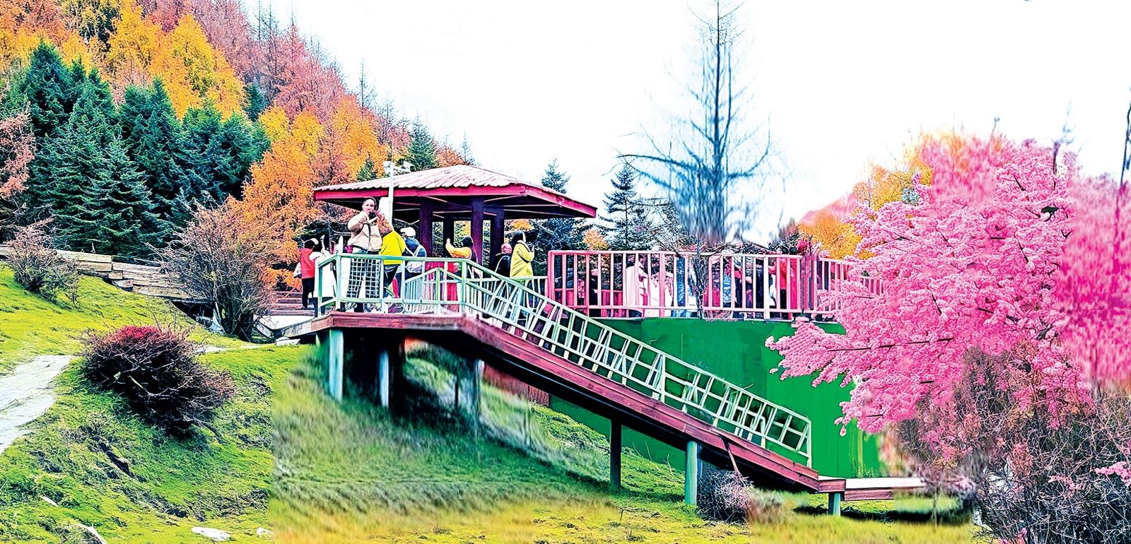 游客穿行于景区的木质栈道上,仿佛置身于斑斓林海,目光所及,皆是极致的鲜艳。而前不久的降雪更为连绵的山峦与茂密的森林覆上一层洁白的薄纱,构成极具视觉冲击力的画面。