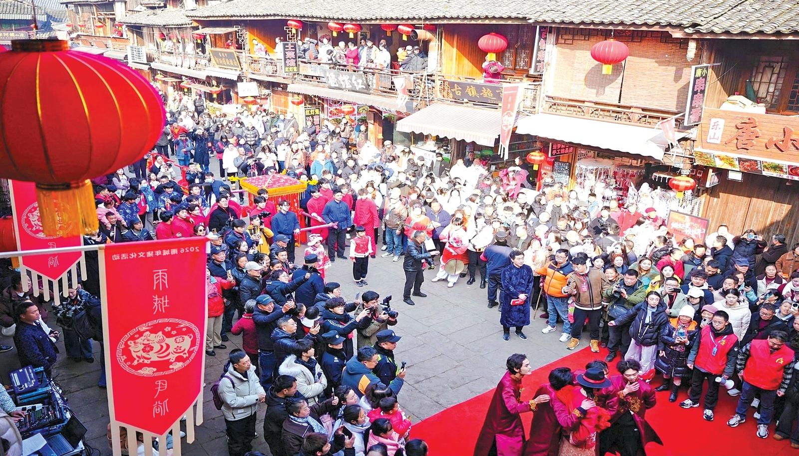 “没想到能‘参演’古人的婚礼,还吃上了地道的年猪宴,年味太浓了!”带着全家老小来体验的游客王女士,道出许多人的感受。活动在赠送手写春联与祝福中温情落幕,许多游客意犹未尽,举着春联在古镇里拍照留念,久久不愿散去。